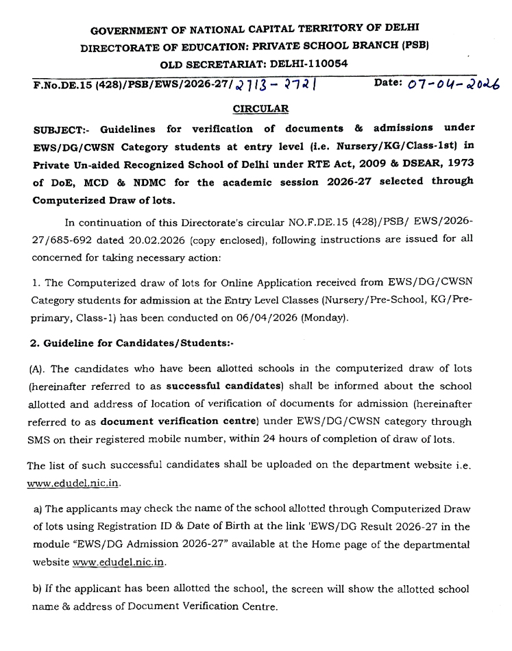 List of Successful Candidates Selected under EWS/DG Category in Nursery for Session 2026-27